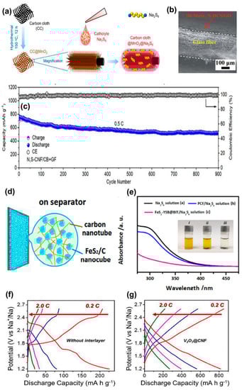 (a) CC@MnO2@Na2S6 cathode. Reproduced with permission [66]. Copyright 2019, Elsevier. (b) FE-SEM image of MoSe2/N-HCS/GO-coated glass fiber (GF) separators. Reproduced with permission [53]. Copyright 2021, Royal Society of Chemistry. (c) Cycle performance RT-Na/S battery with an N, S-CNF/CB+GF separator. Reproduced with permission [108]. Copyright 2022, Elsevier. (d) Scheme of FeS2/C nanocube/CNT-coated GF separators and (e) demonstration of NaPS adsorption capability. Reproduced with permission [81]. Copyright 2021, Elsevier. Voltage profiles of RT-NaSBs (f) without interlayer and (g) with V2O3@CNF interlayer. Reproduced with permission [109]. Copyright 2021, Elsevier.