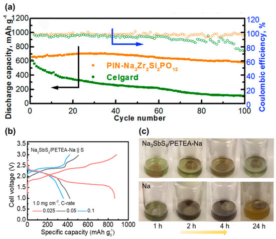 Coating polymers on SSE can enable quasi-solid-state behavior when coupled with a few drops of liquid electrolyte. Exploring that viewpoint, a NASCICON-type Na3Zr2Si2PO12 SSE with a polymer coating with intrinsic nanoporosity (PIN) on the anode side was developed with improved interfacial contact with Na [149]. The Na‖PIN-Na3Zr2Si2PO12‖CNF/S cell fabricated with a few additional drops of NaClO4/TEGDME exhibited cycle performances (550 mA h g−1 at 0.2 C after 100 cycles) far superior to that of cells with conventional Celgard and NaClO4/TEGDME electrolyte (Figure 8a).