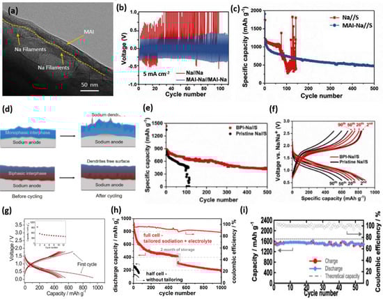 (a) Cryo-TEM micrographs of the as-deposited Na with MAI, (b) galvanostatic stripping/plating test of Na symmetric cells with and without MAI at 5 mA cm−2, and (c) cycle performance of RT-NaSBs with and without MAI. Reproduced with permission [158]. Copyright 2020, Elsevier. (d) Schematic illustration of the effect of cycling on Na anode with and without BPI (e) cycle performance and (f) voltage profiles of RT-NaSBs with and without BPI. Reproduced with permission [159]. Copyright 2020, Cell Press. Voltage profiles of (g) Na–Sn–C/TEGDME4-NaCF3SO3/HCS–S full cell. Reproduced with permission [119]. Copyright 2013, Royal Society of Chemistry. (h) Comparative cycle performance of RT-NaS cells with 1 M NaClO4 0.2 M Na2S/P2S5 in TEGDME|Na anode (black lines) and a hard carbon anode sodiated in 1 M NaPF6 in DEC: EC + FEC (6:4 + 1% vol.) (red lines). Reproduced with permission [124]. Copyright 2016, Wiley. (i) ASSB using an S-MSP20-Na3SbS4 composite electrode. Reproduced with permission [138].