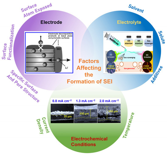 Schematic diagram of the factors (electrodes, electrolyte and electrochemical conditions) affecting the formation of SEI.