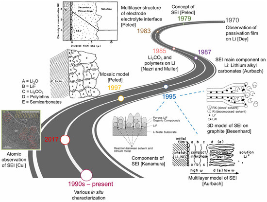 Based on the electrochemical impedance spectroscopy (EIS) and Fourier transform infrared spectroscopy (FTIR) results, Zaban et al. [30] drew a conclusion that SEI is a multilayered structure consisting of a dense inorganic inner layer and a porous organic outer layer. SEI was further depicted as a mosaic structure in which the salt was deposited in separate clumps and the contribution of grain boundaries to the total impedance of SEI was emphasized by Peled et al. [31]. Since then, the notion that SEI is a multilayer film with each layer forming a mosaic structure was widely accepted. Clear evidence was reported by Zheng et al. [32] who showed 3D multilayer SEI structures on silicon electrodes using in situ atomic force microscopy (AFM). Wu et al. [26] summarized the timeline in explorations of SEI, as shown in Figure 2.