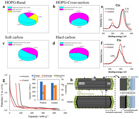 Based on the above findings, Oka et al. [60] coated a layer of amorphous carbon on the graphite anode surface as an LIB anode, named coated in Figure 3e–h, and graphite was named pristine. The amorphous carbon improved the uniform crystallinity of the graphite surface structure and suppressed the massive decomposition of the electrolyte at the edge planes. As shown in Figure 3g, this layer of amorphous carbon reduced the amount of SEI formed below 1 V vs. Li+/Li, thereby increasing the ICE to 87.7%. In addition, as shown in Figure 3e,f, the SEI produced on the amorphous carbon surface has more lithium carbonate and lithium fluoride, improving the stability of the SEI at the edge planes. Figure 3h shows the schematic diagram of SEI without and with the amorphous carbon layer.