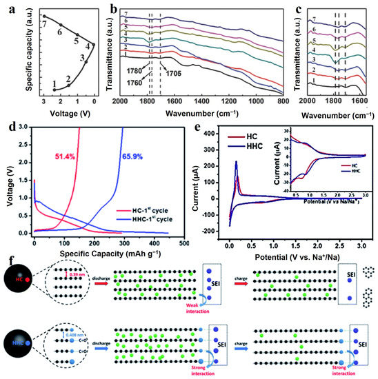 (a) Charge/discharge profile of the electrode during the initial cycle at 0.2 A g−1, (b,c) ex situ FTIR spectra of electrode at the selected potentials indicated in (a) [73]. Copyright 2017, Wiley-VCH. (d) Galvanostatic charge and discharge profiles of HC and HHC at the first cycle at current density of 100 mA g−1. (e) CV curves of HC and HHC electrode, inset is the magnified image. (f) Proposed mechanism via stabilized solid electrolyte interface between the oxygen functional group and electrolyte [74]. Copyright 2020, Royal Society of Chemistry. (The green and purple circles represent sodium and oxygen atom, respectively. The blue circles represent atoms in SEI. Additionally, electrolyte molecules were illustrated as black hexagonal rings.).