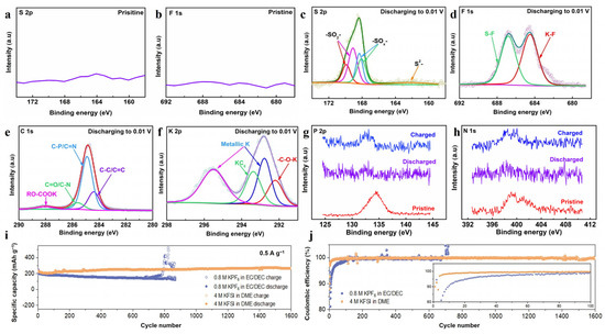 Interfacial nitrogen bonds catalyze the production of more inorganic compounds and the increase in the inorganic layer ensures the stability of SEI [81]. This is very beneficial to prolong the cycle life of the carbon material. Yuan et al. [82] showed that the nitrogen groups catalyze the decomposition of potassium bis(tri-fluoromethylsulfonyl) imide (KFSI) to produce more inorganic sulfur-containing compounds and inorganic substances containing S-F and K-F bonds. XPS measurements on the pristine P/N co-doped three-dimensional interconnected carbon nanocage (denoted as PN-CNC) electrode used as the anode of potassium-ion batteries (PIBs) do not obtain peaks of S or F, as shown in Figure 5a,b. However, after the first discharge, the spectrum of S indicates the decomposition of KFSI (Figure 5c) and the formation of S-F and K-F (Figure 5d). Additionally, a very low intensity RO-COOK signal was observed in the spectrum of C in Figure 5e, indicating that the amount of organic substances in the SEI was very small, while inorganic components were predominant. The SEI with more inorganic components endows the electrode with extremely stable cycling performance, maintaining an ultra-high capacity of 188.7 mAh g−1 for 3000 cycles at a current density of 2 A g−1. Additionally, XPS studies have shown that the process of discharging to 0.01 V and then charging to 2.5 V corresponds to a significant weakening of the P and N peak until it disappears and then recurs (Figure 5g,h). This suggests that P and N directly participates in the electrochemical process of potassium ion storage. A similar study was reported by Yi et al. [83] in the DME electrolyte with a higher KFSI concentration, in which a multi-dimensional N-doped carbon nanopolyhedron@nanosheet (M-NC) anode of PIBs achieved excellent cycling stability, maintaining a capacity of 289 mAh g−1 at 0.5 A g−1 after 1600 cycles (Figure 5i), and the coulombic efficiency was maintained at near 100% (Figure 5j) in PIB.