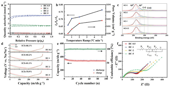 The carbon material has a long enough time to adjust the internal structure, surface morphology and impurity composition in the case of a slow heating rate and long treatment time. Xiao et al. [91] used four different heating rates (0.5 °C/min, 1 °C/min, 2 °C/min and 5 °C/min, named, respectively, as HC-0.5, HC-1, HC-2 and HC-5) to pyrolyze sucrose precursors at 1300 °C, the properties of the as-prepared hard carbon are shown in Table 1. The slow heating rate is favorable to the hard carbon crystallinity as shown by the smaller d002, larger La, Lc and increased IG/ID, and more sp2 hybridization carbon (Table 1 and Figure 6c). Nitrogen adsorption–desorption measurements (Figure 6a) and Brunauer–Emmett–Teller (BET) surface areas (Figure 6b) showed that HC-1 had the smallest pore volume and pore size; in addition, HC-0.5 could not even be measured accurately due to the gradual closing of the micropores. The slower heating rate provides sufficient time for gas escape, microporous closure and carbon atom movement and reorganization, which promote the growth of hexagonal carbon rings and contributes to the formation of defect-less graphite flakes with extended base plane size. Superior structural features greatly reduce irreversible capacity loss, permitting the HC-0.5 to achieve the highest ICE of 86.1% (Figure 6d) and maintain stable after 100 cycles at a current density of 20 mA g−1 (Figure 6e) in SIBs. This also facilitates the formation of SEI with lower impedance. The resistance of SEI (RSEI) was 98.96 Ω and only 10.09 Ω under fast heating and slow heating rate, respectively (Figure 6f). In a study reported by Han et al. [95], mangrove wood was heat-treated at 500 °C at high pressure (0.7 MPa) for a long period (39 days). The ICE of hard carbon obtained by this method was as high as 80% in LIBs. It was attributed to the long-time high temperature treatment that increases the structural order of the material, decreases the pore size (mainly distributed between 0.3–0.55 nm) and reduces impurity elements such as H and O (the atomic ratios of H/C and O/C are 4.88% and 3.52%, respectively).