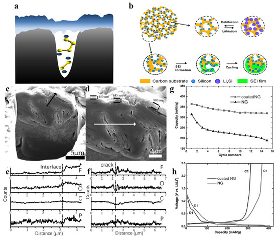 However, the presence of pores increases the specific surface area and, therefore, more SEI is needed, resulting in a lower ICE. As shown in Figure 7b, Liu et al. [101] produced chemically vapor-deposited silicon nanoparticles on a porous carbon skeleton, and SEI films formed within the pores until they were completely filled. Compared to the closed protection mechanism in Figure 7a, this mechanism greatly increases the area of the SEI, resulting in a huge irreversible capacity loss (approx. 80%). Zhang et al. [102] first introduced the concept of “internal SEI” in LIBs, which means that SEI can also be formed in cracks or pores inside the material. This team obtained the edge plane morphology of natural graphite microspheres (NG, Figure 7c,d) by focused ion beam (FIB) method and carried out elemental line scan analysis (ELSA) to study the internal SEI. As shown in Figure 7e, the contents of F, O and P are significantly different in the bulk phase and the surface SEI. Additionally, the cracked ELSA (Figure 7f) shows strong F and O peaks, similar to the intensity of both in the outer SEI, which indicates that SEI was also formed in the internal layer. Further studies [103] showed that when the NG was coated with a layer of non-graphitic pyrolytic carbon as LIB anode, the SEI formed on the surface of the coated NG became thinner and denser, which inhibited the generation of internal SEI, thus reducing irreversible capacity loss and improving cycling stability (Figure 7g,h).