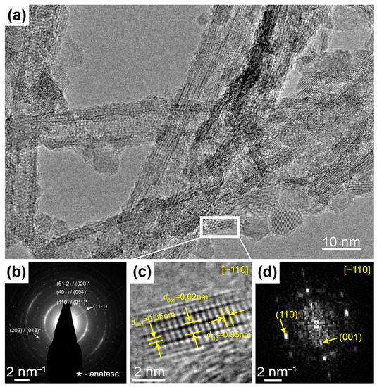 HRTEM imaging and SAED experiments confirmed the TiO2(B) structure in the examined samples. Figure 2a shows a bunch of nanotubes where different lattice spacings could be resolved. Most of them are in good agreement with theoretical ones for TiO2(B) and it is shown in more detail in Figure S2. The electron diffraction pattern for this area (Figure 2b) reveals a number of reflections which could be associated with the TiO2(B) phase. However, some observed spacings may also belong to the anatase phase (marked with *). To clarify this point, we have found a well-oriented nanocrystal (Figure 2c). This nanocrystal’s structure can be uniquely determined as a monoclinic TiO2(B) phase (PDF No. 46-1238) because it has a specific period d001 = 0.62 nm. Figure 2d shows a Fourier transform of image Figure 2c.