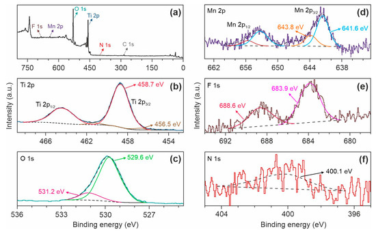 (a) XPS survey spectrum and corresponding high-resolution scans of the (b) Ti 2p, (c) O 1s, (d) Mn 2p, (e) F 1s, and (f) N 1s peaks for the TO-Mn/F/N-06 sample.
