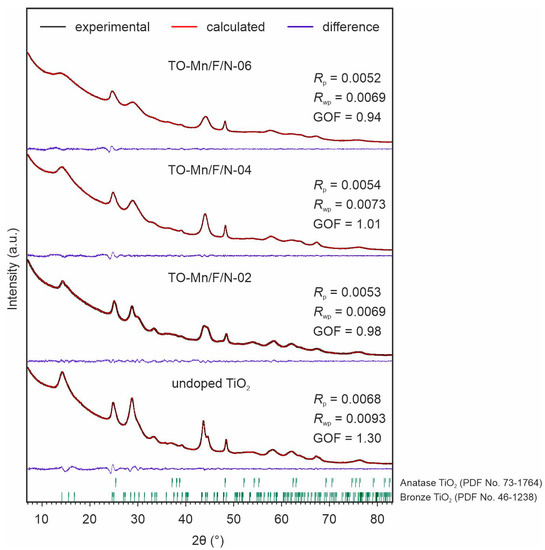 In the XRD patterns of undoped and Mn, F, N co-doped TiO2 (Figure 5) a broadening of peaks is observed suggesting crystallites with nanoscopic dimensions. All considered samples contained two phases of titanium dioxide. Most of the reflections refer to the bronze titanium dioxide having a monoclinic structure with a C2/m space group (PDF No. 46-1238), whereas other ones belong to the anatase modification (PDF No. 73-1764).