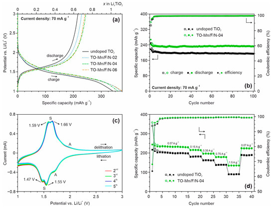 Figure 8a depicts charge/discharge profiles of the first cycle at a current density of 70 mA g−1 for unmodified and (Mn, F, N) co-doped TiO2 samples in the half-cell configuration.