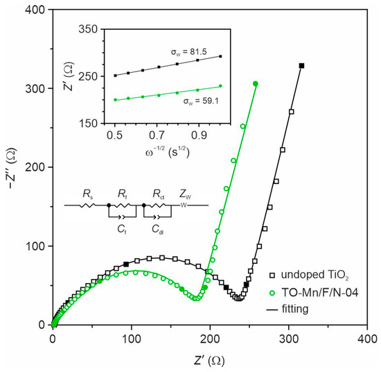 EIS spectra for undoped TiO2 and TO-Mn/F/N-04 electrodes in the half-cells registered at 3 V (frequencies of 0.1, 1, 10, 100, and 1000 Hz are marked with filled symbols). The insets show EEC applied for fitting and plots of real impedance against the inverse square root of the angular frequency used for estimation of the Warburg factor.