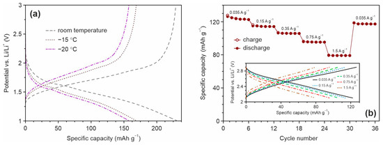 (a) Charge and discharge profiles for TO-Mn/F/N-04 electrode at room temperature, −15 and −20 °C registered at a current density of 70 mA g−1 in the half-cell configuration and (b) rate capability studies (after pre-cycling CV experiments) of the TiO2(B)/LiMn2O4 full-cell in the range of 2.1 and 2.9 V at various current densities with the corresponding charge/discharge profiles (inset).