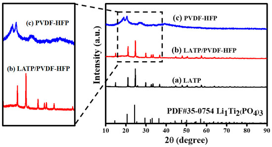 X-ray diffraction (XRD) patterns of (a) Li1.3Al0.3Ti1.7(PO4)3 powder, (b) LATP/PVDF-HFP composite electrolyte membrane, and (c) pure PVDF-HFP.