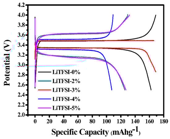 In this study, CR2023 cells with a configuration of X% LiTFSI (X = 0, 2, 3, 4, 5) +LiFePO4 cathode//LATP/PVDF-HFP electrolyte membrane// Li metal anode were prepared, and their performances under continuous charge/discharge cycling at a rate of 0.1–1 C in a potential window of 2.5–4.0 V at room temperature were investigated. The galvanostatic charge-discharge curves of the cells at 25 °C are shown in Figure 5. The batteries were galvanostatically charged and discharged between 2.5 and 4.0 V (vs. Li/Li+) at 0.1 C. In this study, the C rate was determined using the theoretical capacity of LFP, which is 170 mAh g−1. The results revealed that the batteries exhibited a notable charge–discharge plateau at a voltage of approximately 3.4 V vs. Li+/Li, demonstrating the presence of a dual-phase Fe3+/Fe2+ redox reaction via a first-order shift between FePO4 and LFP [42,43]. The cells coupled with LiTFSI-0%, LiTFSI-2%, LiTFSI-3%, LiTFSI-4%, and LiTFSI-5% exhibited discharge capacities of 153.1, 125.5, 168.9, 107.3, and 127.3 mAh g−1 at 0.1 C, respectively. This indicates that, compared to other samples, the SSLBs containing LiTFSI-3%-based composite LiFePO4 cathodes exhibited larger discharge capacities and improved coulombic efficiency (>94%), demonstrating good Li+ reversibility throughout the charge/discharge cycling process. This result indicates that the electrochemical performance of the composite LFP cathode-based cells increased considerably at an LiTFSI concentration of 3%.