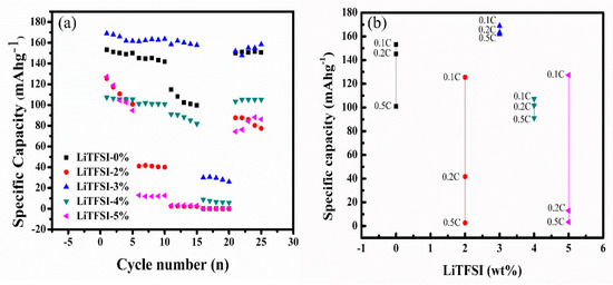 The AC impedance test results (Table 1) revealed that the total resistance values (Rtotal) of the cathodes containing LiTFSI were less than that of the sample not containing LiTFSI (LiTFSI-0%), confirming that the addition of LiTFSI effectively reduced the total resistance of the cathode. Particularly, the battery containing LiTFSI-3% exhibited the smallest resistance value, indicating a reduction in the hindrance of the internal lithium-ion transport path and the interface impedance. The differences between the experimentally measured impedance spectra and the predictor variables in the full spectral regions of all the samples were less than 10%. The resistance of the electrolyte and the component of the contact resistance are represented by the higher-frequency interception of the semicircle with the real axis of impedance. The resistance, a crucial kinetics characteristic of the cell processes, indicates the charge-transfer mechanism of the Faradic reactions occurring at the electrode–electrolyte interfaces. Furthermore, the addition of LiTFSI to the positive electrode not only reduced the total resistance of the battery but also improved the transport of lithium-ions and reduced the resistance of the interface between the electrolyte and electrodes [40]. In summary, the addition of LiTFSI to the positive electrode of the battery improved the efficiency of the battery by reducing its internal resistance and improving the transport of lithium ions [41].