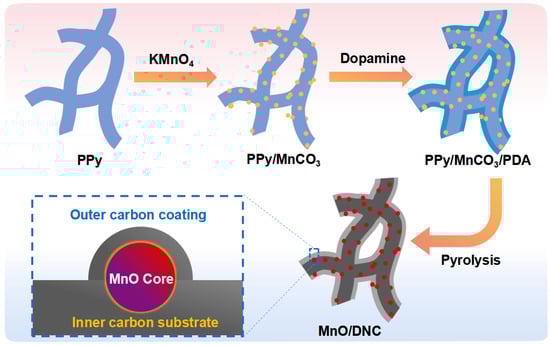 Figure 1 schematically shows the preparation process. The PPy nanowebs are firstly prepared by a simple soft-template method [22], which then hydrothermally reacts with KMnO4. During this reaction process, the superficial C atoms of PPy are oxidized (C → CO2 + H2O) [23], leading to the creation of defects on the PPy surface [21]. Simultaneously, MnO4− is reduced to Mn2+ (Mn7+ → Mn2+) and forms MnCO3 nanoparticles with the dissolved CO2 in the solvent, which prefers to locate at the surface defects of PPy and thus form the PPy/MnCO3 composite. Afterwards, the dopamine is self-polymerized conformally to form a coating layer on the PPy/MnCO3 (denoted as PPy/MnCO3/PDA) [24]. Further carbonization treatment gives rise to the N-doped carbon substrate from PPy and the outer N-doped carbon coating layer over MnO from PDA, leading to the architecture of superfine MnO encapsulated in the dual N-doped carbon substrate. The N-doping sites in the framework will contribute to additional pseudocapacitance in the lithium storage process and enhance the overall electrical conductivity of MnO/DNC [25]. The N-doped carbon nanowebs (NC) derived from the direct carbonization of PPy are also prepared and work as the control sample.
