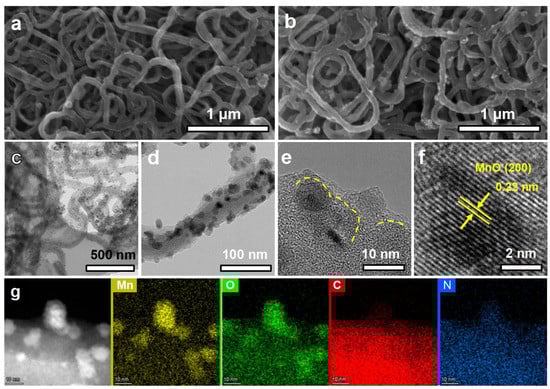 The as-obtained PPy presents the crosslinked nanoweb structure with a diameter of 60–80 nm (Figure 2a) [23]. After loading the MnCO3 and PDA, the fiber diameter of PPy/MnCO3/PDA increases, and the surface becomes rougher (Figure S2a). The XRD pattern further confirms the presence of crystalline MnCO3 with well-indexed peaks (No. PDF#44-1472, Figure S2b). After carbonization, the PPy and PDA are transformed into N-doped carbon, and the MnCO3 was pyrolyzed into MnO nanoparticles (No. PDF#07-0230, Figure S3). As shown in Figure 2b, the MnO/DNC well inherits the nanonetwork structure. The ultrafine MnO nanoparticles were further characterized by TEM. As displayed in Figure 2c,d, the size of MnO nanoparticles is about 5–10 nm, which distributed uniformly on the fibers without obvious agglomeration. The outer carbon layer conformally covers MnO nanoparticles (Figure 2e), with a d-spacing of 0.22 nm (Figure 2f), corresponding to the (200) plane of cubic phase MnO [26]. Figure 2g shows the EDX elemental mapping of MnO/DNC, indicating that Mn/O are concentrated in the particles area, while C/N disperses both in the carbon fiber and particles, proving the structural characteristics of N doping in both the carbon coating and fiber network.