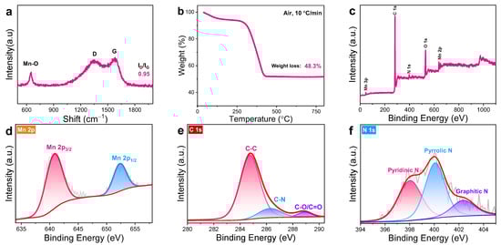 (a) Raman spectra, (b) TG curve, (c) XPS survey spectra of MnO/DNC and its high-resolution XPS spectra of (d) Mn 2p, (e) C 1s, and (f) N 1s.