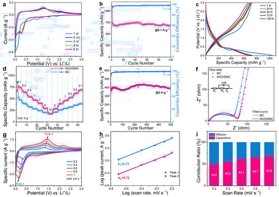 (a) CV at 0.1 mV s−1; (b) Cycling performance and (c) GCD curves of MnO/DNC at 0.1 A g−1; (d) Rate performance of NC and MnO/DNC; (e) Long-term cycling performance of MnO/DNC at 2 A g−1; (f) EIS curves, equivalent circuit diagram, and fitted EIS curves of electrodes; (g) CV curves at each scan rate; (h) Linear fitting of log(i)–log(v) curves; (i) and Capacitive-controlled proportion of MnO/DNC at various scan rates.