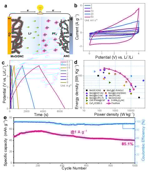 (a) Schematic diagram of the energy storage mechanism of LIC based on the MnO/DNC//ANC; (b) CV curves and (c) GCD curves of the LIC; (d) Ragone plots of the LIC with comparison of previously reported LICs; (e) Cycling stability at 1 A g−1 of the LIC.