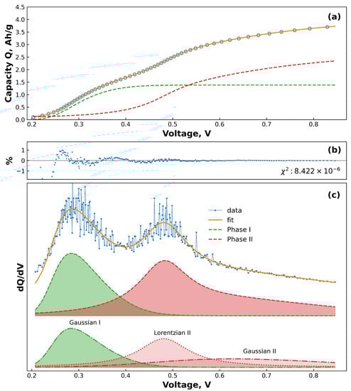 Conversely, GCD curves can also be interpreted as integrals (i.e., cumulative distribution functions) of dQ/dV peaks [32,35,36]. Fitting functions used in previous research include Lorentzian, Gaussian, and pseudo-Voigt distributions, where the number of components corresponds to the number of phases in the GCD curve. This solves the issues that arise from data smoothing when fitting dQ/dV curves and allows for fitting of lower-resolution data, but the main focus has been on estimating the state-of-health (SOH) of full cells. These methods have been shown to give excellent fit to cells containing lithium iron phosphate (LFP), nickel manganese cobalt oxide (NMC), and graphite, especially at low charge–discharge rates [32,35,36,37,38]. For half-cells where Li foil is used as a counter electrode, this approach can be used to extract information about material behaviour from cycling data without the need for relying on dQ/dV curves.