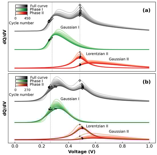 Output of fitting Equation (1) to the data, displayed as dQ/dV and showing the evolution of the curves with cycling for (a) 40 nm TFs, and (b) 9 nm NWs. Each curve is an average of x cycles, where x is of the total number of cycles. The locations of the dots and diamonds correspond to and , respectively. The dotted vertical lines denote c for the first cycles.