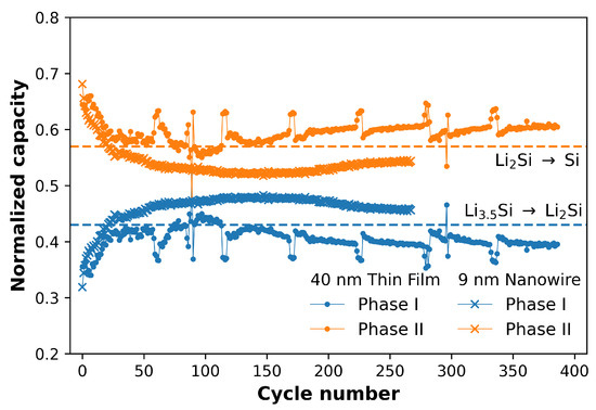 To further highlight the ability of this method to show differences between the datasets in ways that are not obvious by dQ/dV, the capacities of the two phases normalized to the total capacity determined by the fitting are shown in Figure 3. The horizontal dotted lines denote the initial guesses for the fitting of the phases as discussed in Section 3.1. While this shows that the assumption made initially, i.e., that the datasets consist of 100% LiSi at the start of delithiation and 100% Si at the end of delithiation, was not completely accurate, the fitting reveals interesting differences between the TF and NW samples. For both TFs and NWs, the first 10 to 20 cycles show an increase in the contribution to the total capacity from phase I. However, while phase I for the TFs contributes less capacity than expected throughout cycling, the capacity contribution from phase I for the NWs continues to increase and eventually exceeds the amount of capacity expected from the initial assumption made in Section 3.1. The initial increase in contribution from phase I can be explained by the progressive lithiation of Si at the start of repeated cycling proposed in the literature [19,20,47]. In this case, the resistance to lithiation of fresh Si electrodes results in the incomplete conversion of LiSi → LiSi during lithiation. This means that at the start of the delithiation step the Si consists of a mixture of LiSi and LiSi, and results in less capacity contribution from phase I during delithiation, and more from phase II.