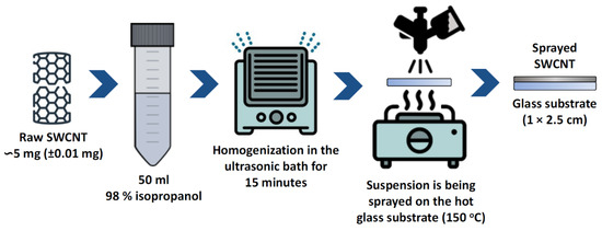 The SWCNT film sample was fabricated using CNT (0.6 mg) deposition on a glass slide (1.0 × 2.5 cm). One edge (1.0 × 1.0 cm) was covered by a 50 nm thick gold electrode. For the preparation of the sample, 5 ± 0.01 mg of SWCNTs (Nano RAY-T Ltd., Stopinu Parish, Latvia) were weighed, mixed with 50 mL of isopropanol (98%), and placed in an ultrasonic bath for 15 min to achieve a homogeneous suspension (Figure 1). The obtained suspension was sprayed on a hot (150 °C) microscope glass slide with a spray gun until the predetermined weight (0.6 mg) was reached. To anneal the sample, a single thermal reduction step for 1 h at a temperature of 400 °C under 200 sccm H2/2000 sccm Ar flow was performed. The 400 °C temperature was chosen, because it represents the conditions, at which CNT based heterostructures using physical vapor deposition are fabricated [39]. The annealing at this temperature can enable more efficient synthesis, as multiple steps can be performed without the heating/cooling of the substrate.
