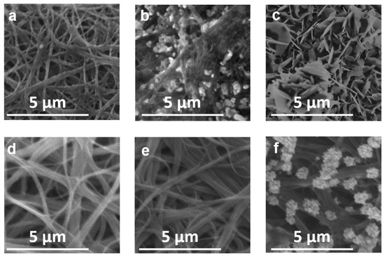 SEM images of the u-SWCNT (a–c) and a-SWCNT (d–f) in 5 M LiNO3 before cycling (a,d), after the 5th cycle (b,e) and after the 100th cycle (c,f).