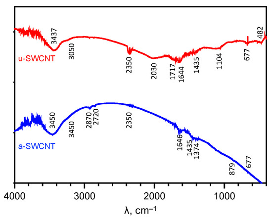 The FTIR spectra of u-SWCNT (Figure 3) shows a wide band at 3437 cm−1 corresponding to O–H stretching vibrations. The C=O (at 1717 cm−1) and C–O (at 1104 cm−1) peaks represent the presence of the carboxyl groups. These carboxyl groups can emerge from adsorbed CO and CO2 in u-SWCNTs due to surface oxidation that can occur when CNTs after synthesis are released into the laboratory environment [34]. The peak at 1435 cm−1 is associated with aromatic C=C. The lines at 677 cm−1 and 1644 cm−1 are characteristic of alkene =C–H groups and vibrations of the C=C covalent bonds, respectively [44]. The peak at 2030 cm−1 corresponds to the C=O group, characteristic of mononuclear metal carbonyls, and the peak at 482 cm−1 corresponds to vibrations of the Fe-CO bond [40,44]. The peak at 2350 cm−1 corresponds to atmospheric carbon dioxide and is used for calibration. Obtained results were in good agreement with the literature data of FTIR spectra for carbon nanomaterials [45,46].