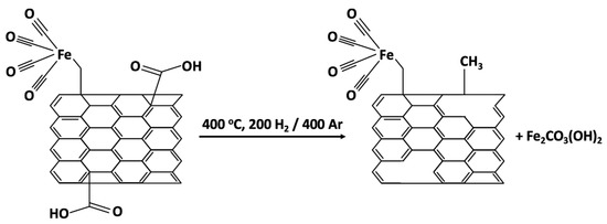 For the a-SWCNT sample, the carboxyl groups are reduced to –CH3 groups, as evidenced by the appearance of a band at 1375 cm−1. There are no peaks characterizing the C–O and C=O bonds in the spectrum. However, there is a broad band at 3450 cm−1, this O–H stretching mode is more likely due to adsorbed water molecules. The absorption bands at 2870 cm−1 characterize asymmetric vibrations of -CH2- groups and at 2720 cm−1 characterize fluctuations in the C-H bond. The peak at 879 cm−1 indicates the presence of iron carbonate Fe2CO3 or, more likely, Fe2CO3(OH)2 [47]. Additionally, as reported by Zhang et al. [48], the removal of the oxygen-containing functional groups create nanowindows in the SWCNT’s graphene sheet and lead to the increased overall porosity of the material.