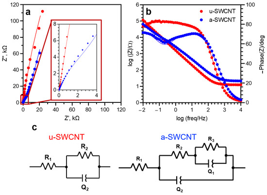Thus, the system can be described by a model of a polarizing electrode with a distributed capacity (Figure 5). The equivalent circuit of the u-SWCNT electrode includes an electrolyte resistance (R1), a constant phase element (Q1), and a charge transfer resistance (R2). The constant phase element reflects the exponential distribution of the parameters of the electrochemical reaction associated with overcoming the energy barrier during charge transfer due to the desolvation of ions on the hydrophobic surface of the SWCNT electrode [53]. The form of the impedance hodograph for the annealed sample (Figure 5 a-SWCNT) indicates the presence of an additional R-Q element, which prevents the use of the u-SWCNT equivalent circuit for the a-SWCNT sample. The first response of the system in the high-frequency range of 0.5–10,000 Hz, which is described by the elements R2-Q2, refers to the outer layer. The low-frequency response (0.01–0.5 Hz), which is described by R3-Q1 elements, refers to the formations of some nanowindows on the graphene sheets of annealed nanotubes [48]. The values of the phase angle (θ = −67°) indicate the heterogeneity of the surface.