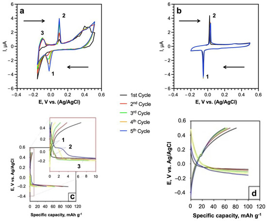 The charge/discharge potential plateaus (Figure 6c,d) in the initial five cycles are in good agreement with the CV results (Figure 6a,b). Both samples (u-SWCNT, a-SWCNT) demonstrated small plateaus which represent the Li+ intercalation and deintercalation processes (Figure 6a,b). For the u-SWCNT sample, the additional charge plateau was observed as well at −0.16 V vs. Ag/AgCl indicating the reaction between surface carboxyl groups with lithium ions.