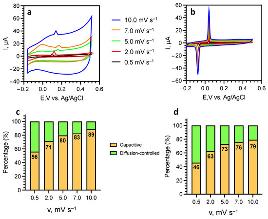 Cyclic voltammetry curves at different sweep rates for u-SWCNT (a) and a-SWCNT. (b) and the contribution ratio of capacitive and diffusion-controlled current at different scan rates for u-SWCNT (c) and a-SWCNT (d).
