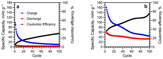 The cycling performance of the u-SWCNT anode at 0.5 C in 5 M LiNO3 showed very low specific capacity values (Figure 8a). The initial discharge capacity (6.5 mAh g−1) was significantly lower than the charge capacity (100 mAh g−1) showing the Coulombic efficiency of only 6.5%. During cycling, the Coulombic efficiency gradually increased due to a significant reduction in charging capacity and reached 30% by the 100th cycle. Irreversible capacity is most likely associated with the irreversible reaction between lithium and -COO- groups of SWCNT [58,59], which is also supported by the cyclic voltammetry (Figure 6a) and FTIR data (Figure 3).