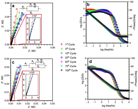 The reasons for such a 10-fold increase in the capacity of a-SWCNT compared to the u-SWCNT sample can be explained by the formations of some nanowindows on the graphene sheets after annealing, as evidenced by the obtained impedance spectrum (Figure 5). For a better understanding of the processes of charge accumulation in u-SWCNT and a-SWCNT samples during cycling, impedance spectra and the equivalent circuits were obtained for the anodes in discharged states (Figure 9).