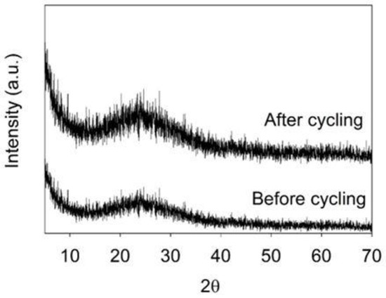 After 5 cycles, no change is observed for the a-SWCNT sample (Figure 2e); however, in the case of u-SWCNT, the sample is partially covered with crystals (predominantly LiNO3). This difference is due to the fact that lithium interacts with -COOH groups of u-SWCNT already during the first cycles, thus staying on the electrode surface and forming nucleation centers around which crystals can start to form. After 100 cycles, the crystal structures cover the whole surface of the u-SWCNT electrode (Figure 2c). For the annealed sample, crystals are also formed on the surface; however, they are dispersed along the entire length of the nanotubes and do not cover the entire surface (Figure 2f). The SEM (Figure 2) and EDX data (Supplementary Figures S1–S8) did not reveal any structural changes for the u-SWCNT and a-SWCNT electrodes after cycling. Additionally, the before and after cycling XRD pattern (Figure 10) for the SWCNT on the glass substrate showed that the sample is amorphous—no significant diffraction peaks were identified, except for a broad, low intensity band with a Bragg angle at 2θ between 20 and 30° (Figure 8). This indicates that material is amorphous and the XRD signal most likely is a sum of the SWCNT electrode and the glass substrate. After cycling (100 cycles), there were no significant changes in the XRD pattern.