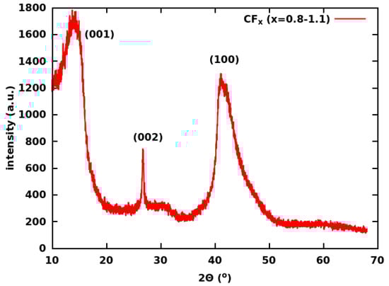 Graphite fluoride (CF) was purchased from ACS Material (Product Number GT1FS012) with the F/C ratio being 0.8–1.1. The X-ray diffraction (XRD) pattern (at Cu K X-ray radiation) of this CF is shown in Figure 1. The (002) reflection at 26.7 deg indicates the presence of some non-fluorinated graphite species.