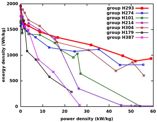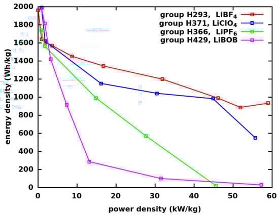 Surprisingly, even the as-purchased CF (with no ultrasonication, Group H304) allowed for relatively high energy densities at high power densities when used with a PAN binder and LiBF electrolyte. However, when the PAN binder was exchanged with PVDF, the energy density rapidly decayed at high power densities (Group H214). If the CF was ultrasonicated in FB·OEt, then the performance became better even if the PVDF binder was used (Group H101); however, it was still greatly inferior to Group H293. This indicates the beneficial effects of BF on the power density similarly to [37]. The ultrasonication of CF in FB·OEt with the LiOX·BF additive (Group H274) did not improve the performance of the simple ultrasonicated CF active material when the PAN binder was used. This stresses again the robustness of the Group H293 cathodes. The goal of using the LiOX·BF additive was to exchange the -F functional group with -OBF3 on the surface of the graphene for a greater interlayer distance. A similar reaction between CF and NaOH resulted in -OH functionalized graphene [55], albeit in the presence of a catalyst only. Another reaction between CF and NaCN resulted in -CN functionalized graphene [56] and paracyanogene [57] without a catalyst. The potential of such a metathesis reaction between CF and LiOX·BF is still there, but the reaction conditions should be more carefully investigated.