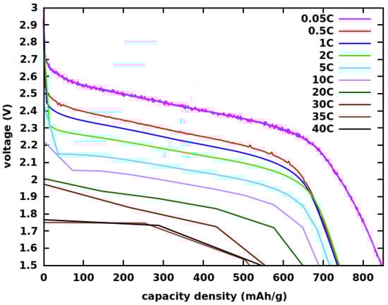 The voltage vs. capacity density curves during the discharge of the Group H293 cells can be seen in Figure 3. They compared very well (especially for high C rates) with similar curves in the best-performing CF cells of the literature, such as those in [33,34,35,36,37] and especially those in [32], which we consider to be probably the best-performing CF cell demonstrated to date. While the CF used in [32] is based on fluorinated graphene microspheres, our method uses the traditional and much-easier-to-synthesize graphite fluoride. Other components of our cathode, such as the PAN binder and the electrolyte (1 M LiBF in PC:DME:DOL(1:1:1)), are also conveniently available. Therefore, our method appears to offer a more economic composition and implementational simplicity, while providing a competitive performance.