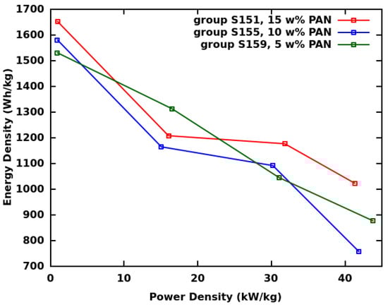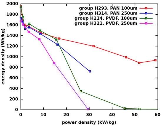 The gravimetric energy vs. power density curves of cells with 100 m-thick cathodes and 1 M LiBF electrolytes are shown in Figure 2. The values are given with respect to the weight of the CF in the cathode. These cells differ in the type of the binder (PAN or PVDF) and the preparation of the CF active material (ultrasonication duration, solvent, and additive). The C rates of the discharge were between 0.05 and 40.