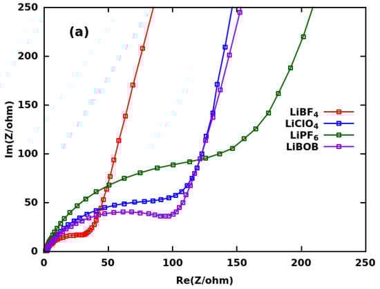 The semicircles of the impedance data are less complete before discharge than after discharge. The more complete semicircle is typically a sign of the formation of a solid electrolyte interphase (SEI). Interestingly, the charge transfer resistance of the LiClO electrolyte decreased greatly after the SEI formation and became about the same as that of LiBF. This suggests that these latter two electrolytes may form similar SEIs on the anode and their SEIs may be very different from the SEIs of the LiPF and LiBOB electrolytes. References [53,54] suggested that DOL polymerizes in the presence of suitable catalysts, such as Lewis acids, and this polymerization brings advantages for the formation of a stable SEI. Indeed, LiBF can dissociate to LiF and BF, and BF is a Lewis acid, capable of initiating the polymerization of DOL even before discharge. On the other hand, LiClO appears to be able to cause a similar effect during discharge. LiClO is a well-known oxidation agent and a mild Lewis acid. It may release an oxygen radical during the discharge of the battery, while LiClO would form and DOL would polymerize. Similar to the polymerization of DOL, the polymerization of the cyano group side-chains of the PAN can happen through the same effects and contributed to the reduced charge transfer resistance in the presence of the LiBF and LiClO electrolytes. The polymerization of the cyano group side-chains of the PAN resulted in a continuous -C=N--conjugated pi-electron system, which likely improves the electronic conductivity in the system. Furthermore, the strands of the PAN can potentially also serve as ion conduction channels in the cathode based on the well-known property of PAN to form solid (gel) polymer electrolytes with high ionic conductivity [59,60].
