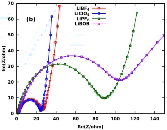 Impedance (Z) of Li-CF cells with 1 M LiBF, LiClO, LiPF, and LiBOB electrolytes before (Panel (a)) and 1 h after (Panel (b)) full discharge at a 0.5 C rate. The electrolyte solvent was PC:DME:DOL(1:1:1).
