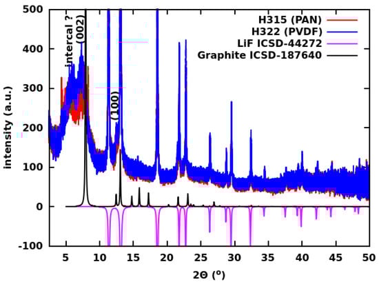 Synchrotron XRD measurements were carried out on the discharged Li-CF cells with the PAN and PVDF binders in order to investigate the extent of the hypothetical inhibition of LiF crystallization by the PAN binder. The cells were discharged at a 0.5 C rate using 250 m-thick cathodes. We found a large amount of crystalline LiF discharge product, as indicated in Figure 8. Our experience was contradictory to that of [37], which found no crystalline LiF in the XRD patterns of the discharged CF cathodes when a small concentration of BF gas was used in the electrolyte. Therefore, we cannot confirm a similar degree of inhibition of LiF formation when the PAN binder is used. It is, however, possible that the inhibition caused by the PAN binder only slows down the LiF formation on a shorter time scale during discharge, and therefore, it could not be detected by our synchrotron XRD measurements about three weeks after the discharge. Consequently, the inhibition mechanism proposed by Jones and Hossain in [39] may still be valid.
