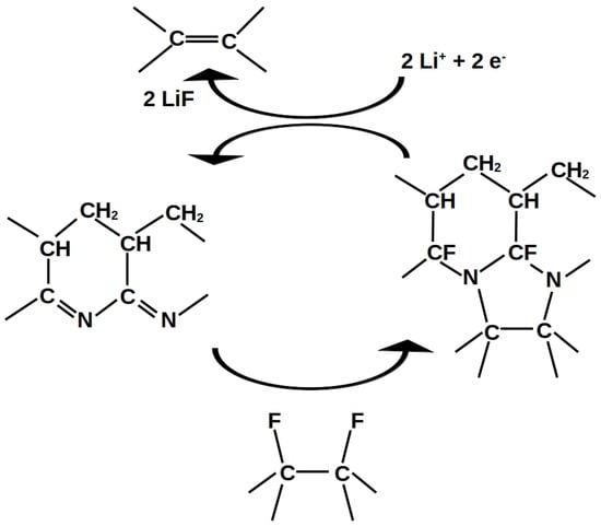 We propose that the side-chain polymerized PAN (PPAN) functions as an electro-catalyst. The catalytic mechanism is depicted in Figure 11. PPAN and CF form a cyclo-adduct after the nucleophilic attack of PPAN on CF. This cyclo-adduct is the activated complex of the reaction mechanism. When the battery discharges, the cyclo-adduct is reduced and splits into a residual CF with a newly formed C=C double-bond and a recycled PPAN, while also LiF is formed.