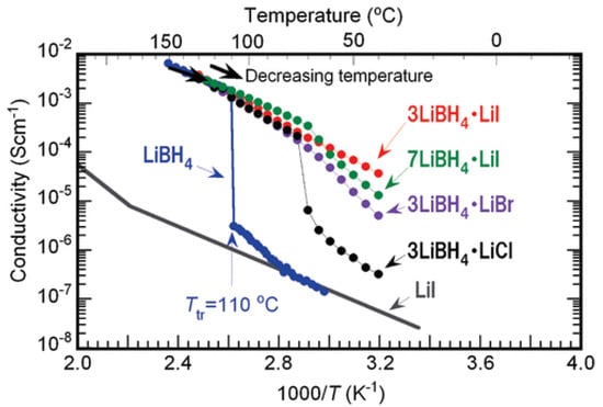 - Maekawa, H.; Matsuo, M.; Takamura, H.; Ando, M.; Noda, Y.; Karahashi, T.; Orimo, S. Halide-Stabilized LiBH4, a Room-Temperature Lithium Fast-Ion Conductor. J. Am. Chem. Soc. 2009, 131, 894–895. [Google Scholar] [CrossRef]