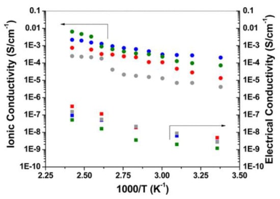 - Appetecchi, G.B.; Croce, F.; Dautzenberg, G.; Mastragostino, M.; Ronci, F.; Scrosati, B.; Soavi, F.; Zanelli, A.; Alessandrini, F.; Prosini, P.P. Composite polymer electrolytes with improved lithium metal electrode interfacial properties: I. Electrochemical properties of dry PEO-LiX systems. J. Electrochem. Soc. 1998, 145, 4126–4132. [Google Scholar] [CrossRef]