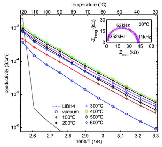 - Blanchard, D.; Nale, A.; Sveinbjörnsson, D.; Eggenhuisen, T.M.; Verkuijlen, M.H.W.; Suwarno; Vegge, T.; Kentgens, A.P.M.; de Jongh, P.E. Nanoconfined LiBH4 as a Fast Lithium Ion Conductor. Adv. Funct. Mater. 2015, 25, 184–192. [Google Scholar] [CrossRef]