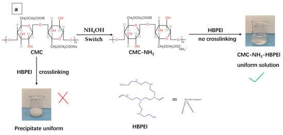 CMC was dissolved in deionized water and configured into a 2 wt% aqueous solution, followed by a drop of 3.0 g aqueous ammonia solution with a concentration of 25 wt%. The 5 wt% HBPEI aqueous solution and CMC-NH3 solution were stirred at a mass ratio of 2:8 for 6 h to obtain a homogeneous CMC-NH3-HBPEI solution.