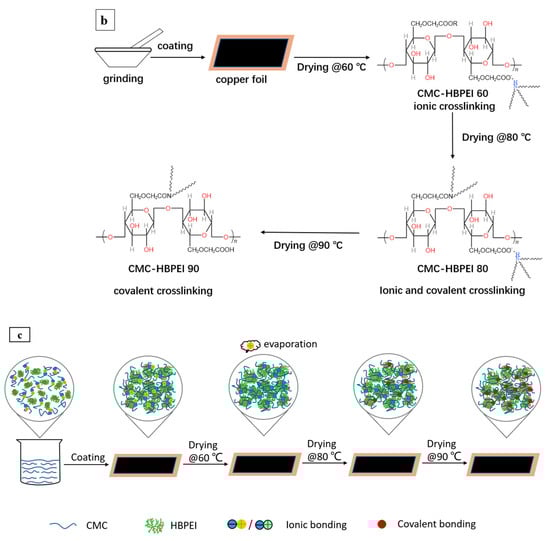 Regarding this, we attempt to regulate the preparation process of the composite material in order to “switch” the ionic bonds of the 3D network, and partially “convert” them into covalent bonds, constructing a composite binder with a hybrid ionically covalently cross-linked network structure. In this study, carboxymethyl cellulose (CMC) and hyperbranched polyethyleneimine (HBPEI) were chosen as the primary binder materials. CMC, a linear polymer containing carboxymethyl groups, can serve as the skeleton of the composite binder [19], while HBPEI, a hyperbranched polymer containing numerous amino groups, can provide abundant hydrogen bonding sites for the composite binder [20,21]. The combination of CMC and HBPEI can create a mechanically stable and strongly adhesive binder material. Furthermore, during the mixing process of CMC and HBPEI in an aqueous solution, the ionic bonds between the CMC and HBPEI are temporarily “switched off” by adding the neutralizer ammonia. Then, during the vacuum drying process of the anode, the ionic bonds between CMC and HBPEI are “switched on” with the evaporation of ammonia. As the temperature increases, carboxylic acid and amino groups gradually react to form amide bonds (covalent bonds) [22]. By following these two steps, the ionic bonds between carboxymethyl and amino groups can be “switched” and partially “converted” into covalent bonds, thus achieving the desired hybrid cross-linked network binder.